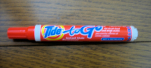Tide to Go--This is amazing stuff!! It makes all fruit stains disappear, and even takes out some stains that have been washed and dried, but didn’t come out during the process. It is small enough to keep in your purse or kitchen drawer. it runs out quickly, but I figure it’s a lot cheaper than buying a new outfit! It is not suitable for large stains, and it does not remove blood stains. It is being sold in Japan, now--my local Seiyu carries it.