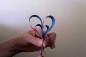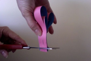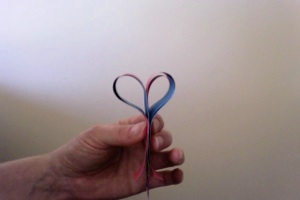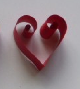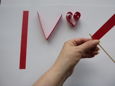 Cut a strip of paper 1/2 inch or 1 inch wide. The length depends on how big you want the heart to be. For the one shown here, the length of the strip is the length of the short side of a sheet of paper. Fold the strip of paper in half, and curl the ends around a skewer, toothpick or nail. Remove the skewer and glue the curls together. If the curl is too tight, unroll it with your fingers, then re-roll it with your fingers, without using the skewer.