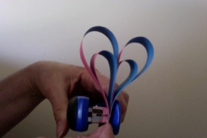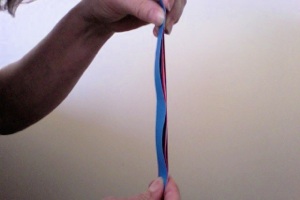 If you plan for a classroom of kids to make these, cut out strips of paper with a paper cutter ahead of time, then in class, all the kids have to do is fold and glue them. If you don’t have a paper cutter, use lined notebook paper as a guide, but cut on every other line rather than every line, since the strips would be too narrow if you cut every line. Save time by cutting 3-4 sheets of paper at a time with the same effort as cutting one. You do need a good pair of scissors to do this. The sheets of paper do tend to slide, so readjust the sheets after every few cuts.