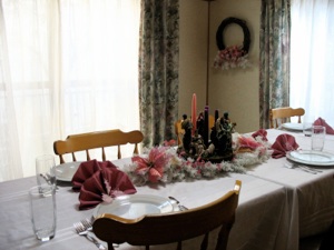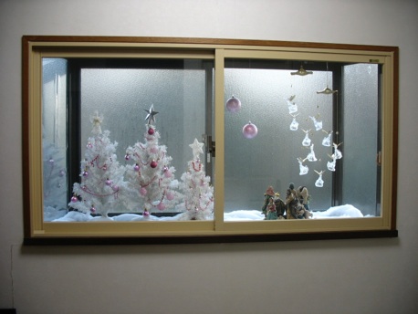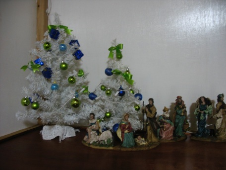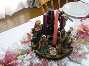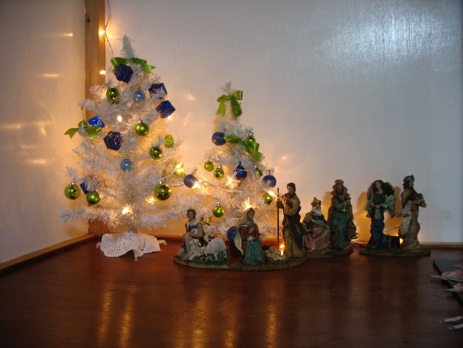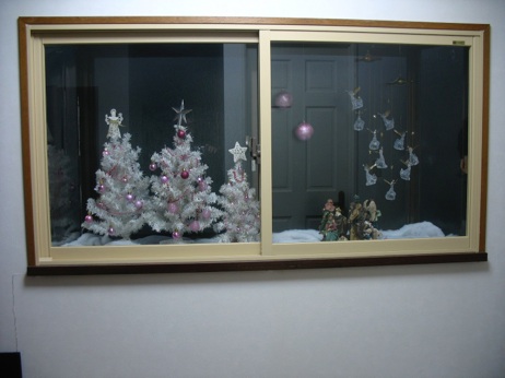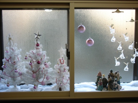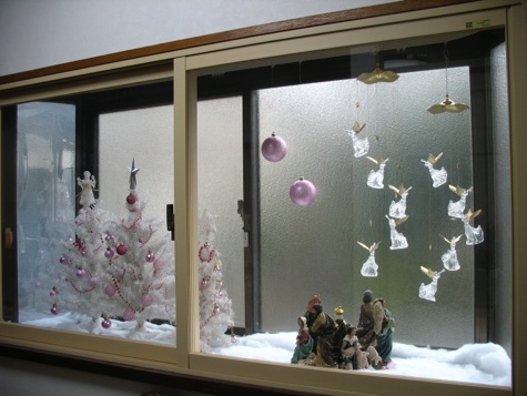 One year I put the resin nativity figures in the bay window in the foyer. Since it did not fill up the whole window, I put white Christmas trees decorated with pink ornaments on the opposite side to match the rest of the decorations in the foyer. The window turned black at night, and reminded us of the night Jesus was born when the angels appeared to the shepherds to announce His birth.