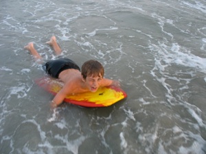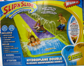 Here is an inexpensive way to play with water in your own yard. If you have a hill, that is best, but flat ground works, too. If stores don’t have this kind of thing, you can make your own by staking strips of plastic into the grass. Spray with a hose, and take a running dive on your stomach.