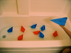 Make paper boats and airplanes. Each team can have their own color. Then float the boats in the bathtub and try to sink them with the paper airplanes. The winner is the person with the most boats still afloat after all the planes have been thrown.