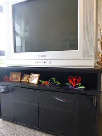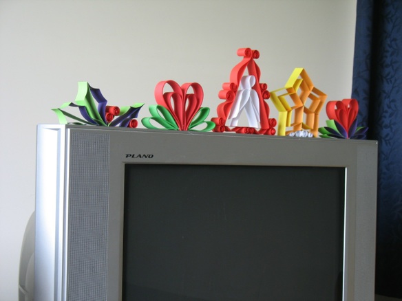 Decorate narrow ledges like the top of the T.V., on windowsill, or bookshelves with these easy to make paper decorations. Of course, they can be hung on the tree, too.