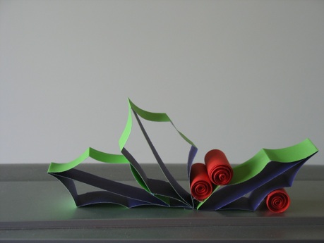 Make holly leaves by folding strips of green paper into thirds, sort of--”one third” should be slightly shorter than the other “two thirds.” The short third becomes the vein in the middle, and the longer “two thirds” become the outside edges of the leaves. Fold these outside edges in two places to make the points, then glue both tip and the stem end. Make red berries by rolling red strips of paper into spirals.