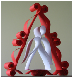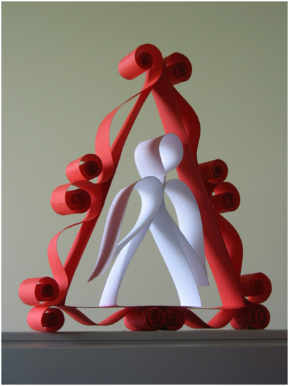 The angel is a little plain by itself, so dress it up with a curly red frame. Glue strips of red paper into a triangle to fit around the angel--make it 2 layers thick for added strength. Cut 6 strips of paper and curl the ends. Glue them to the triangle frame, but squeeze the ends toward the middle so the middle humps up.