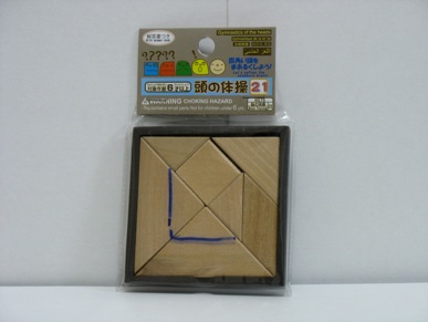 Wooden tangram set that needs 2 cuts to make it able to make a cross. Cut where indicated by the blue lines.