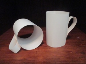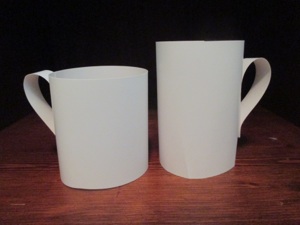 To make the handles, cut small strips 1/2 inch by 6 inches long. Glue the ends together to form teardrops. Glue the teardrops to the cups to form handles. Glue them over the seam to hide it.
