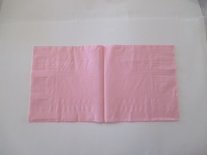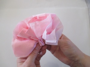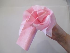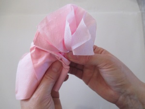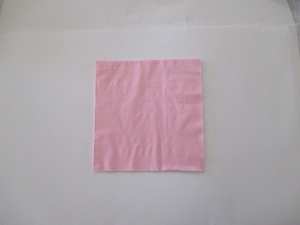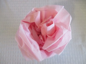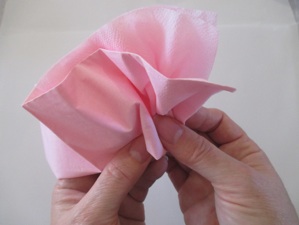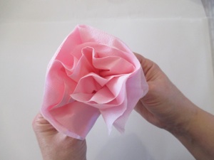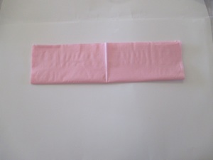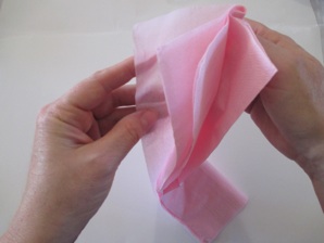 Make carnations by opening the napkin into a rectangle, then fold it in half so it is a narrow rectangle. Note: if you do not have colored napkins, stack 3-4 sheets of colored tissue paper for each flower so you can have layers of petals. Cut the paper into 30 cm. squares. Then fold into a rectangle (as in the middle photo), then fold in half again (as in the photo on the right.)
