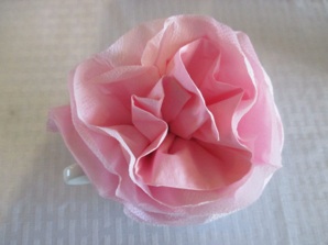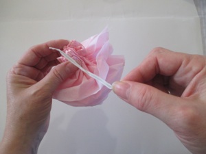 Make sure that the folded edge is on the inside of the flower, and the loose edges are on the outside. Begin pinching the bottom folded edge to make gathers.