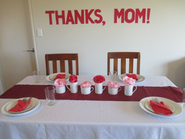 Make a centerpiece bouquet of flowers by lining up a row of cups down the middle of the table, and topping each one with a flower. You can line up teacups that you own, or buy cheap ones at a dollar store, or make cups out of paper (see instructions below). Then fold the napkins to look like flowers--that is a lot cheaper than buying fresh flowers! Cut out letters to say, “Thanks, Mom!” for an inexpensive, but pretty Mother’s Day table.