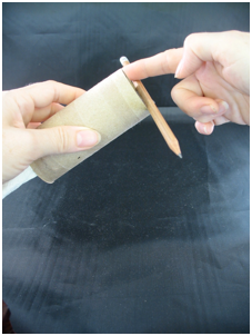 Tape one end of a strip to an anchor point, such as a table. Or have the children work in pairs, and one child can hold the end while the other child twists the paper towel length. The children can simply twist the paper towel strip, or... push the loose end of the paper towel strip through a toilet paper tube, and tape it to a pencil or chopstick. Now comes the fun part.