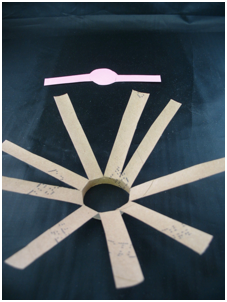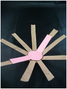 The easiest way to make this bottom piece is to lay the cut tube on top of a piece of paper, draw around the inside of the circle, and along 2 spokes, then cut out. If you mark the 2 spokes on the toilet paper tube before moving it off the paper, it will be easier to glue it in place once it is cut out, since the spokes are not the same distance apart. Otherwise it can be a puzzle as to which two spokes it was supposed to line up with.
