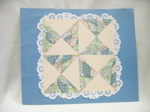 Quilt card: This looks more complicated than it is. Give your child 4 squares of color coordinated paper, 2 in a solid color and 2 in a pattern, such as wrapping paper, origami, or scrapbooking paper. Sometimes dollar stores sell scrapbooking paper. Show your child how to cut from corner to corner to make triangles. Arrange the triangles into a quilt pattern on a background and glue them in place. If you want a lacy edge, cut the outer edges off of doilies and tuck them under the edges of the quilt before the glue dries.