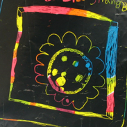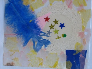 Suncatcher collage: This one was made by a two year old. Older kids will have fun making it too--they will just have more sophisticated designs. Lay out a piece of clear contact paper on a table. Give your child things to arrange or drop onto the contact paper, such as doilies, pre-cut hearts, sequins, feathers, and tissue paper to tear and stick on. When your child is finished, or loses interest, put another piece of clear contact paper on top. Trim any crooked edges, or pieces that stick out.