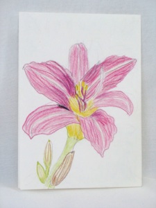 Flower picture card : Put a pink or red flower in front of your child to inspire this artwork. She may not need any motivation other than colored pencils or markers to get started. Boys are less likely to want to draw a flower. You might inspire your son by suggesting he draw a robot or monster. The novelty of using graph paper may be all the motivation he needs to get him started. You can point out how to use the graph paper to make it symmetrical by drawing a line down the middle, then draw half of it on one side of the line, then count the squares to draw the same thing on the other side of the middle line.