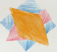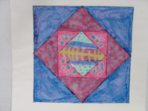 Concentric squares: This design is made by drawing a square, then another square inside, but rotating it so that the corners are in the middle of the straight sides. Color each square with a different color or pattern. This design was drawn with special markers that can draw on top of other areas already drawn with marker, to change the color. Even without these markers, interesting patterns can be made with regular markers, or cut squares from patterned paper.