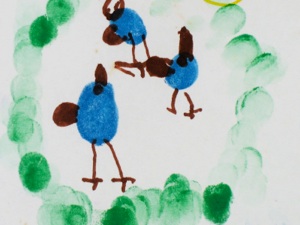 Thumb print picture card : This was designed by a 4 year old. Use several colors of stamp pads and markers to make thumb print pictures. Let the children press finger tips to the stamp pad, and then the paper, then use markers to finish the pictures--as in the picture above, adding heads, feet and tails to turn the blobs into birds. If your child needs inspiration, you can probably find a book in the library with more ideas. If you don’t want to have to worry about getting permanent ink all over clothes and furniture, make sure these are all made with washable ink.