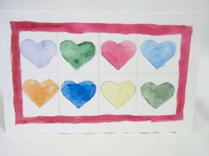 Repeating heart pattern: Use a heart pattern or cookie cutter to draw hearts in pencil. Paint each heart and the border in different colors. As an alternative, cut hearts out of various colors of paper or wrapping paper. Rearrange until a good design is achieved, then glue it in place. Heart stickers or stamps may be an easier option, though they can’t be rearranged.