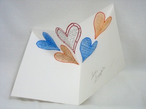 Pop-up card : fold the card in half, then open it and pull the middle top down as you fold the card shut again. Glue on heart cut-outs with love messages written on them. Glue this inside another card so the front of the card will be a rectangle.