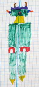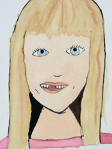 Self Portrait card : Hand your child a mirror and ask her to draw herself. If your child is not used to drawing, a mirror might be too intimidating. If so, back off and let her draw what she feels comfortable with. Even if your child is used to drawing, a project like the lower picture will take quite a bit of time. It is best to break it down into 3 stages. The first stage is to draw it in pencil. The second stage is to draw over the pencil in permanent marker. The final stage is to color it with water colors. If you child is not used to painting with water colors, you can make it a little easier by using special colored pencils that can be turned into water colors by painting with a wet brush after the color has been drawn on with the pencils. These pencils are available at craft stores and art supply stores.