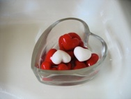 These glass hearts were purchased at a hundred yen store, as well as the heart shaped dish they are in.