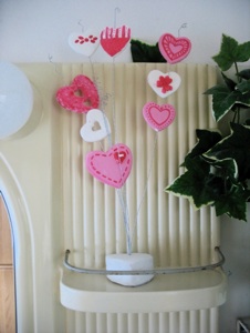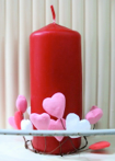 If you have trouble finding heart shaped objects, or if you want more variety, many valentine decorations can be made with a light weight modeling compound such as Hearty (Karui Kaminendo.) On the far left, they are made into a heart bouquet, and on the right, they add interest to a pillar candle. They could even be glued into a circle to form a heart wreath. Another idea for a hand made decoration is to cross stitch hearts and put them in a frame from the hundred yen store,