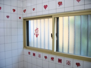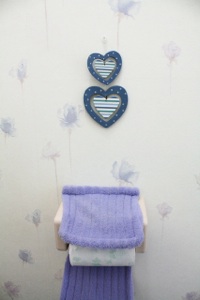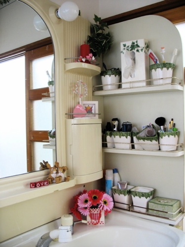 A bathroom with lots of little shelves provides a good place to decorate with seasonal items from hundred yen stores or dollar stores. Candles, figurines, flowers, and heart shaped objects are all pretty easy to find if you keep your eyes open.