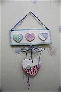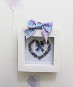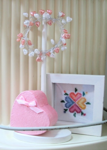 The same materials used in decorations above, look entirely different from the previous projects, and hopefully will inspire you to see the possibilities of how versatile these materials are. The hearts on the left were made from a light weight modeling compound such as Hearty (Karui Kaminendo.) The cross stitched heart on the right has been put in a hundred yen frame, and trimmed with a ribbon from a hundred yen store.