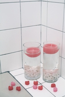 Candles can add a romantic touch to the bath. The bottom third of these vases were filled with small white rocks, then water was added. One vase has more water added than the other so that the candles would float at different heights. Tiny heart shaped candles are sprinkled around the bottom of the vases for added detail.