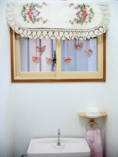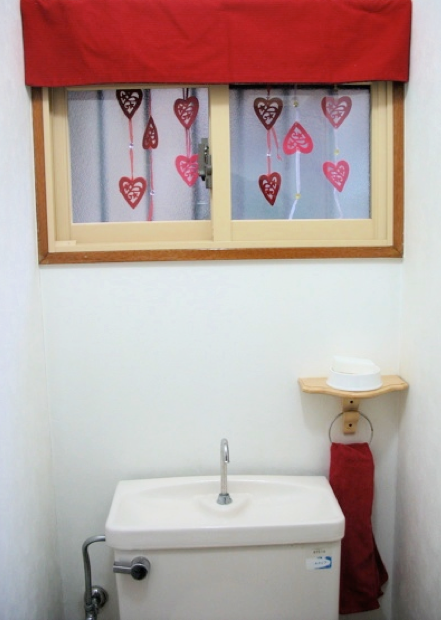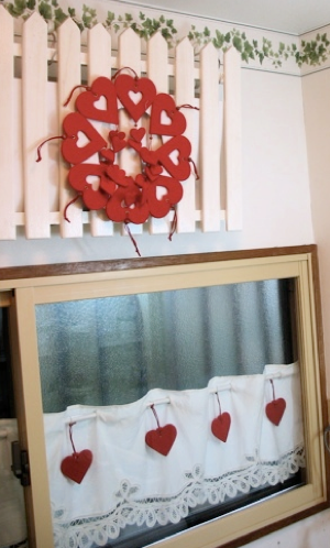 Here are red decorations in the same half bath. The red valance is also a table runner that has been draped over a tension rod. This time the hearts in the window are 2 felt garlands hung from hooks on the window frame (sold at hundred yen stores, usually at Christmas time.)