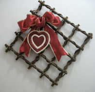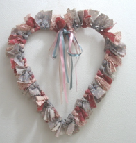 The fabric heart is a relatively quick project as well. After the wire frame has been formed into a heart, rectangles of fabric have been tied onto it--simple enough for even a child to make.
