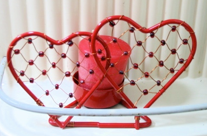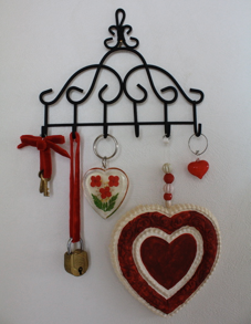 If you can find a decorative key holder, it makes a quick wall decoration when you embellish it with a variety of hearts, either bought or hand made. The key and lock set hung from velvet ribbons symbolize the exclusive love promised in marriage and expressed in the phrase, “You have the key to my heart.”