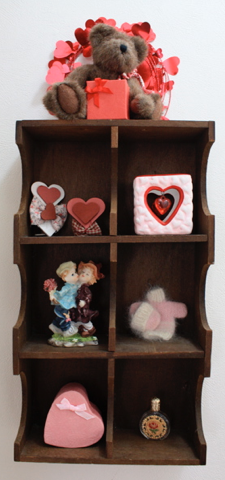 A fun way to decorate the wall is to buy a nick-nack shelf and add heart shaped decorations. Nitori is one store that sells nick-nack shelves and shadow boxes. Hundred yen stores often sell heart shaped items such as candles and boxes, but they are usually sold all year round rather than during the valentine season. For example, the hart garland behind the hear was in the gift wrap section.