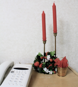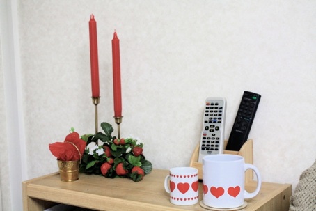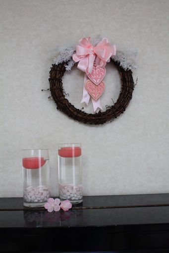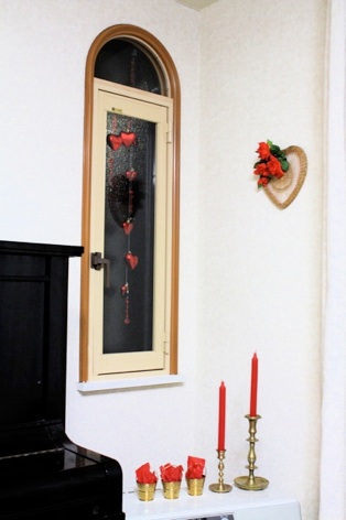 Using similar decorations around the room can pull the decorations together and make it feel like they match, rather than having a hodgepodge of unrelated items. So in this case the strawberry bushes, red candles, and brass candle sticks and buckets continue the theme from the big arrangement on the piano. Sometimes hundred yen stores sell wreaths that are in a heart shape. Here strawberries and red ribbon add