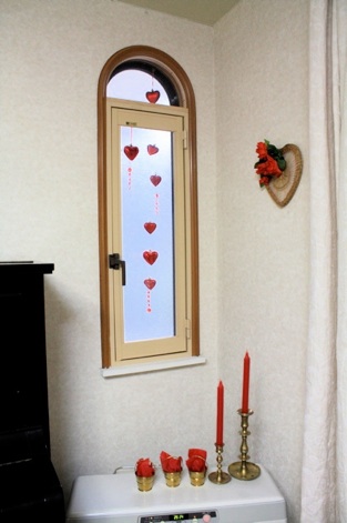 The red felt hearts in the window are sold as Christmas tree ornaments at hundred yen stores. If you want to make your own out of felt, you may want to glue two layers together, or glue a layer of cardboard between the felt so they hold their shape--these are quite thick and stiff, so they will not get floppy even if you hang them for a month.