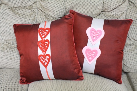 Red throw pillows are great if they can fit into your decor because they can be used for so many holidays--Christmas, Valentine’s day, American Independence day, as well as fall. Just add some embellishments for a quick seasonal change. For a Valentine twist, sew or glue hundred yen felt hearts to wide ribbon. Or cut out your own felt designs. Sew or glue the ends of the ribbon into a loop and slide it on from the side. Don’t use felt for the ribbon portion because it will stretch out of shape when people lean against them.