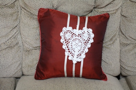 For this variation, sew a heart shaped doily to 3 narrow ribbons and slip them over the pillow from the side. Pink or white pillows would work as well for the Valentine season. If you can’t find cushion covers at the hundred yen store like these, it does not take long to sew them if you have a sewing machine. Don’t bother with zippers--just sew a flap in the back to make it easy to change the covers when the seasons change.