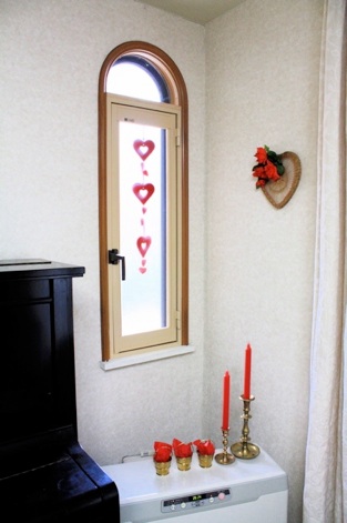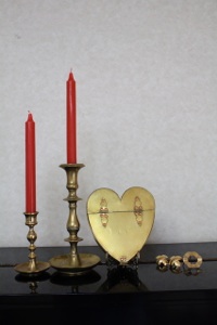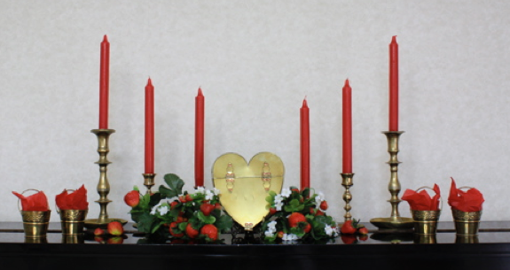 Candles just seem to go with Valentine’s day. Add them to hearts and you have a Valentine’s arrangement. Add lots of candles for a big space and a big statement, or just on or two candles for a small space, or just a hint of Valentine’s. Here the brass heat box is mounted on a plate rack, and the brass is repeated in the candle sticks and the brass buckets. Fill a bucket with candy for each person in the family. As happy memories are made, good feelings become associated with the family. So even after they have grown, if they see hearts, they think, “Oh, Valentine’s day is such a happy day...my family really loves me.” If you like the look, but haven’t seen any buckets at hundred yen stores, use mugs with heart designs, tiny red gift bags, or heart shaped boxes, or paper cups with pipe cleaner handles.
