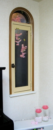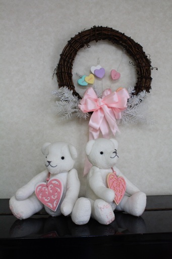 Here are some pink variations--pink felt and wood Christmas tree ornaments from the hundred yen store are held by the white bears, or hung on a wreath. The wreath, purchased at Keiyo D2 at Christmas time, is embellished with branches from a white hundred yen Christmas tree, and a pink ribbon from the hundred yen store. The vases and pink floating candles are also from hundred yen stores, as are the rocks that are at the bottom of the vases. The flowers in the window are also from a hundred yen store. The hearts on the wreath are made from an air drying super light weight modeling compound such as Hearty (Karui Kaminendo sold at hundred yen stores) and threaded onto white florist’s wire, also sold at hundred yen stores, craft stores, and florist’s shops.