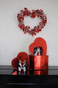 These heart boxes are sold at hundred yen stores. They nest, so they don’t take up so much storage space. Both penguin pairs were purchased at hundred yen stores. The heart on the wall is a hundred yen garland fastened to a hanger that has been bent into a heart shape.