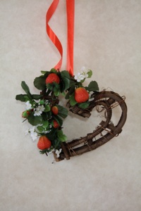 Any heart will do--it doesn’t have to be brass. Here is a variation with a heart shaped basket and doily and accented with “silk” flowers and fake strawberries. A plate rack allows the basket to sit vertically so it can be seen.