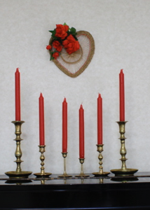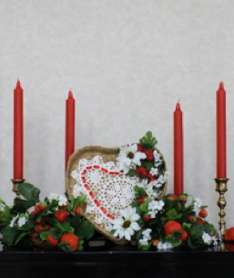 In this variation, the basket heart embellished with “silk” roses is hung on the wall. The candles are arranged so that their heights follow the shape of the heart on the wall. There are so many designs and styles of hearts available, you are only limited by your imagination.