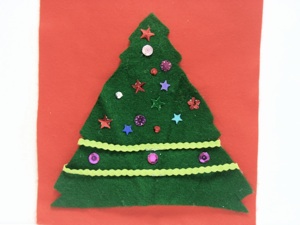 2、緑のフェルトで木を切り取る。まっすぐな三角形に作るか、はしをふくらみのある枝をあらわすように作る