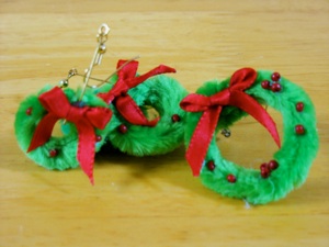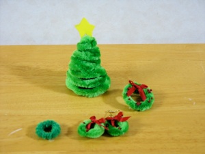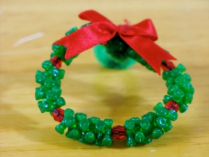 1、緑と赤のビーズに赤のモールをとうして、はしをねじり結び残りを切りとって切り口にリボンをのりずけする。