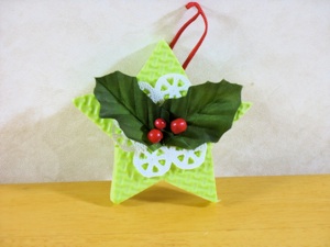 4、星のをぶら下げるループを作るためリボンか糸を用意します。糊で後に貼付けるか、はりで穴をあけ糸をとうします。ループは長くしないで星になるべくちかずけて結びツリーに飾る。