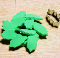 2、ヒイラギの葉をクッキー型を使って粘土を切りぬきます。(100円ストアで2個大小がセットで売られています。)