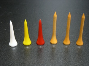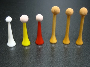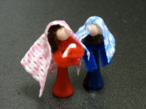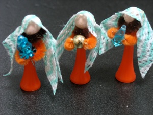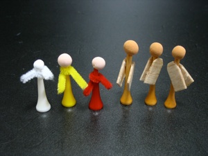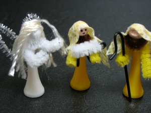 2、いろいろな色のゴルフテイで降誕セットの人物を作る、たとえば天使は白で、マリアは赤