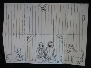 3.子供たちに色紙で全部の形の切り抜き方を教えてください。もし授業で工作を完成する時間がなければ いくつかのクラスにまたがってやってもいいし あらかじめ形を切り抜いておいてあげてもいいです。人物を付け加えたいなら 紙で作る降誕の場面 からダウンロードしてください。