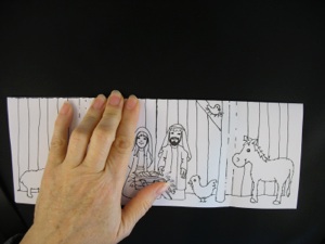 3、開いて再び平たく折ります。このとき最初の折り目から5㎜ずらして折ります。そうすることでカードを開いたときに輪が箱形になります。きれいな長方形を作るには押しつぶしたり折り直して形を整えてください。人形の後ろにこれをのり付けし そっと背景のカードにその輪のついた人形をのり付けします。大きく長い人形には 1つ以上の輪が必要です。このようにカードに人形をしっかり留めると 背景から人形が立ち上がりシーンに奥行きがでます。もし子供たちがこのカードをつくるならステップ3を省き平たく折った輪を使えます。あまり強く押さえると平たくなりすぎるので、しっかりとのり付けした後に人形を少し引っ張ってあげると良いでしょう。同様にカードの外側も3Dに作れます。カードの表 紙を馬屋の戸に見せるにはクラッカーの箱のような厚紙でバーと2つの金具の部分を切り抜きます。厚手の両面テープで金具部分を戸に留めますが、このときバーが金具の後ろに入るように、下のほうだけにテープをつけるように注意してください。