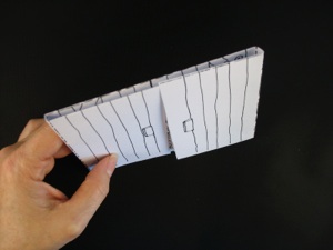 2.点線を二つとも真ん中の方に向けて両サイド折ります。(左下の写真 参照)それぞれの側の二カ所でカードを折ることによって、カードを閉じるときに立ち上がったフィギュアが収まるだけの十分なスペースができます。(左の簡単なバージョンを選んだときに間違ったところで折ったように見えるのを防ぐため二重線をあまり目立たなくしてあります。)